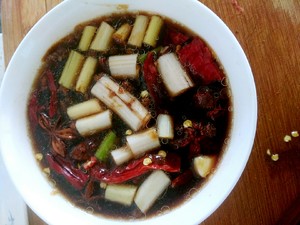 将生抽,老抽,蚝油,料酒,黄豆酱,糖,切成段的葱,切成片的姜,蒜,八角,花椒,红辣椒都放到小碗里,往碗里倒水,调成一碗汁备用。