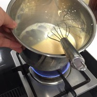 请用小火加温并不停搅拌使其牛奶与蛋黄融合变成蛋黄糊(掌握不好就隔水加热使蛋黄湖出现粘稠)
