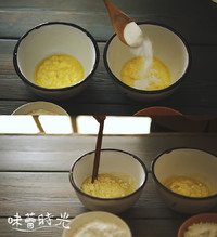 取两个容器,各放入45g黄油(软化到室温状态,没有硬芯.),12g糖粉及45g制作好的炼乳,搅拌均匀。