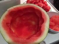 放在盘子里,将西瓜底部的西瓜汁倒出,调入炼乳,少量,炼乳搅拌均匀。