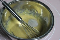 分两次加入鸡蛋,并继续用打蛋器搅打,当鸡蛋和黄油完全融合后再加下一次。