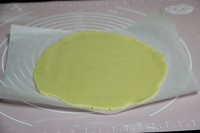 将面团放在油纸上,用擀面杖擀开成0.3CM厚的面片。