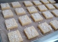 将冻成型的饼干面团取出,切成薄片,排入烤盘,表面撒上椰蓉