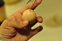蛋的气囊出用针扎孔,就是蛋的大头处。这样煮的时候蛋不容易漏和爆。