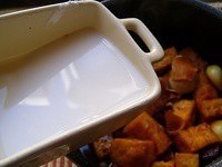 豆腐切成5cm见方的大方块,入7成热的油锅里炸到表面金黄