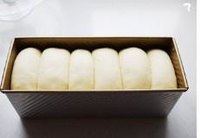 分割成7个面团,松弛10分钟,擀成牛舌形,卷起,放入吐司盒,后来又拿出一块,留做老面团用