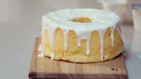 烤好后取出,离桌面30cm的地方摔一下模,然后倒扣在晾网或者拿个瓶子顶住倒扣晾凉即可脱模。 最后可以在成品上撒点儿酸奶做装饰,不仅好看而且还很好吃呢。