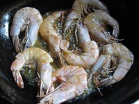 锅中倒入植物油,量略多,烧8成热,然后将虾倒进油锅煎至虾变色