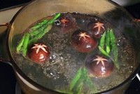 锅中做水,焯熟鲜香菇和芦笋捞出待用