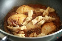 向锅内加入适量的水,至没过鸡腿的1/2高度,倒入老抽调色,白砂糖调味,向锅中加入泡好的腐竹结,大火将汤汁煮沸.