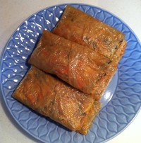 油豆皮,单张打开平铺,如果豆皮干脆要喷水使其变软来方便包入素菜