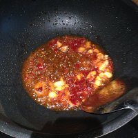 用煎鱼的油炒豆瓣酱、蒜末及姜片。炒出香味后加入泡椒泡姜继续翻炒,加入少许老抽和糖调色调味。