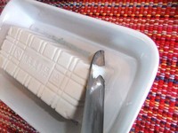 豆腐小心地从盒里取出,整个扣在盘子里,并且用刀划成小块儿。