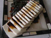 豆腐盒减去四角,将豆腐扣在盘子里;