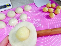将面包团分成8份,将椰蓉馅儿这分成8份,每份面包团包好椰蓉馅儿,搓成圆形。