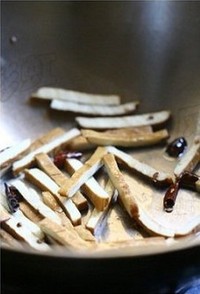 锅烧热倒油,下干辣椒至变色,倒入香干翻炒