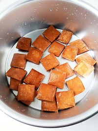 锅里留少量油,放炸好的豆干、冰糖或白糖(多放点)、少量生抽、八角、花椒、桂皮,香叶翻炒,随后加少量热水小火炖20分钟。