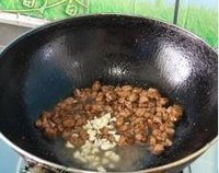 烧至六成熟时,把切好的蒜片和小辣椒放入翻炒
