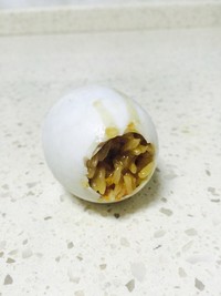 把鸭蛋大头在角上敲破,把顶剥开一个小洞。将里面的蛋白取出。最好将蛋白取干净一些,这样做出来的糯米饭更加美味!