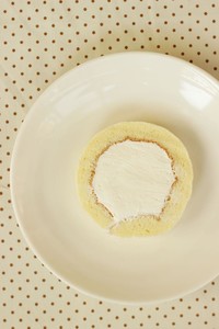 将淡奶油抹在蛋糕体上,用吻刀抹均匀。然后提起左边往中间摁卷一下,接着提起右边往中间和左边的卷吻合后再用尺子隔着油纸往里收,目的是挤压一下蛋糕卷,让它更容易定型。(这一步的图忘了拍)最后包好放入冰箱冷藏定型。