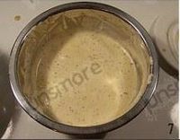 盛1/3的蛋白到5中,翻拌均匀,再把拌匀的面糊全部倒入蛋白盆中,翻拌均匀。拌匀的时候要注意,不要划圈搅拌,以免蛋白消泡