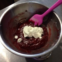 把苹果醋小苏打溶液倒进面糊中,此溶液会继续与可可面糊起反应,面糊会变的细腻,蓬松丝滑,有香气。