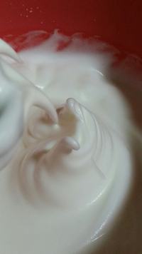 白砂糖和盐混合拌匀,蛋白分三次加入白砂糖打至小弯钩状。