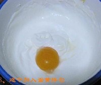 打发好的蛋白粉1/3与蛋黄面糊搅拌,同样的方法拌匀剩下的蛋白后倒入
