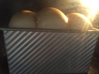 在38度左右的温暖湿润处进行最后发酵。手指按压面团,缓慢回弹,即发酵完成。 发酵好的吐司表面应该是很光滑,略微有点弹性不粘手的。而不是不光滑,很粘手那种。 ps,这个面团比较小,发到8,9分即可。