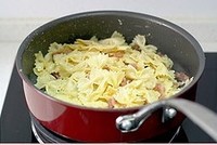 锅子大火烧热烧透后转中火放入切好的培根丁