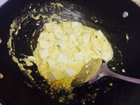 待蛋黄冒泡,倒入沥干水的豆腐翻炒均匀,出锅前加一点鸡精提味。