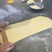 完成3次3折后,把面团摊在撒有面粉的桌面,轻拍打均匀后分次慢慢擀至约0.7厘米厚的长方形