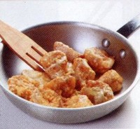 杏鲍菇洗净,沥干,切滚刀块,表面撒上少许红薯淀粉,再均匀裹上一层拌好的面糊。锅内放适量油烧热,放入杏鲍菇炸约3分钟至金黄色,捞出沥油。