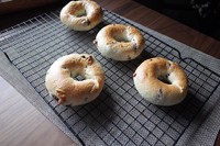 煮完的bagel放入烤箱200℃烤20分钟左右,烤完放在晾架上放凉。微热的时候拿一个吃最赞!