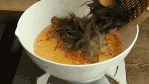 中火油炸河虾 锅中放入清油,油7分热的时候放入河虾,炒到外表变黄就可以捞出了。