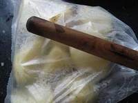 将刚煮好的酸菜汁倒在土豆泥上,可以看到,水很快被土豆吸收了