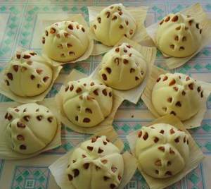 将酵母放入温水融化,加入白砂糖、蛋清(蛋黄放一起面会显得发黄,口感差不多)、牛奶搅匀,加入小麦粉,反复揉合在一起。三光完毕找个温暖的地方发酵!因为北方有大蒸锅一次做太多所以物料克重没有称量!但是和平时我们发面的程序是一样的。注意比平时和的要硬,这样才能保证饽饽的造型好看!