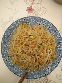 倒入米粉(湿),我们这边通常可以买到湿的米粉,直接炒,如果买的是干米粉必须先煮开,放入绿豆芽一同不停翻炒,加入切碎的干辣椒。