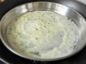 盘子刷油,盘里加一勺米糊,平摊均匀直接放到开水上,大火蒸一分钟好了,用毛巾垫着小心把盘子拿出来,用刮板刮下来上碟。