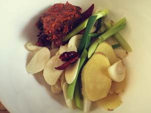 把锅洗净擦干,开火倒油,油可以稍稍多一点。等待油温八成热,把葱姜蒜辣椒一起倒进去翻炒。记得碗就不要扔进去了,炒完也不能吃。还要把桥头火锅底料入锅,用铲子压碎翻炒。