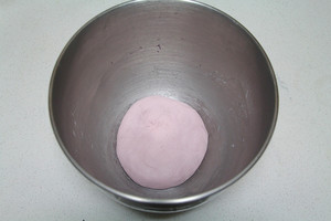 然后倒入一个干净的面盆里,再加入120g紫薯泥和310g面粉。