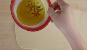 面饼向内折1/3,在翻折的一面再次刷油,并将另一边顺势翻折,切成2.5厘米左右宽的剂子。