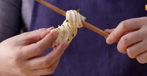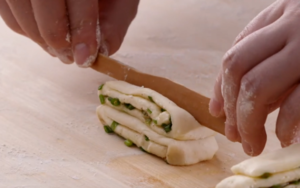 再将剂子慢慢拉长,筷子放在中间对折、扭动打结,制成花卷的生胚