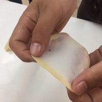 用擀面杖轻轻将面团擀成如图长条形,注意力度,不要擀破掉。