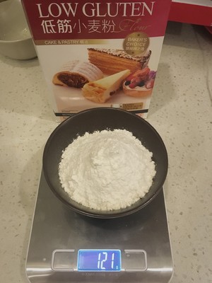 2低筋面粉过筛 筛入1容器中 继续手动搅拌均匀 (比较难搅开。可用细筛过几遍。直至没有沉淀物。此时面糊细滑。盖保鲜膜放入冰箱待用
