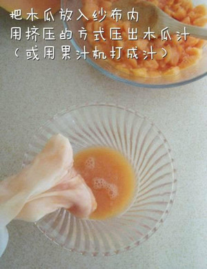 把木瓜放入纱布内,用挤压的方式压出木瓜汁(或用果汁机大成汁)