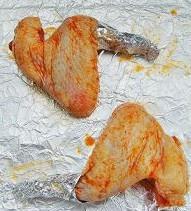 烤盘上放锡纸,鸡全翅把翅尖部分用锡纸包住,放在烤盘上