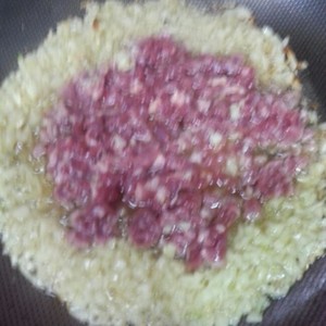材料准备:大蒜,姜,小葱全部切碎,牛肉也切成非常小块,用料酒和胡椒、盐腌制,不要太咸。虾米洗干净。