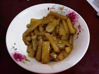 淮山洗净,去皮后切成条状和片状均可,推荐条状,因为在炒的过程中,容易入味切好后装入碗中加水浸润,多换几次水,主要是洗掉汁液。