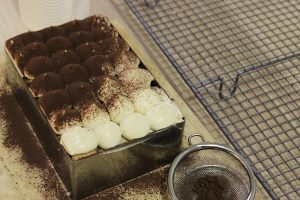 #组装 铺最后一层蘸了咖啡的手指饼干。剩下的奶油马斯卡彭糊放入裱花袋里,挤在表面。筛上一层可可粉。